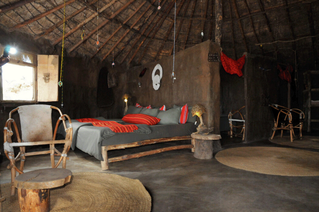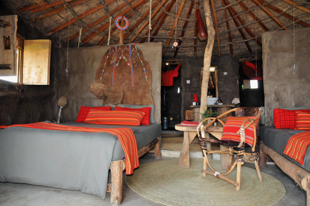 Accommodation: In the middle of the wilderness of the Maasai steppe are seven Maasai-themed bungalows surrounded by a 200-hectare nature reserve, with great views on the Kilimanjaro, Africa‘s highest mountain. Behind it and until the border with Kenya there is the savanna, home to the Maasai people.  All bungalows are equipped with modern rain shower and flushing toilet, and furnished with hand crafted furniture including beds, side tables, wardrobes, and Maasai-styled décor. Bungalows are available for family accommodation. Lighting and water heating is by solar power.