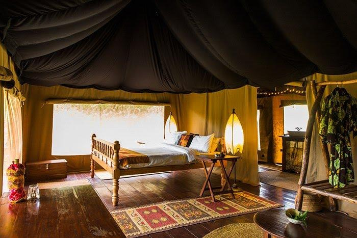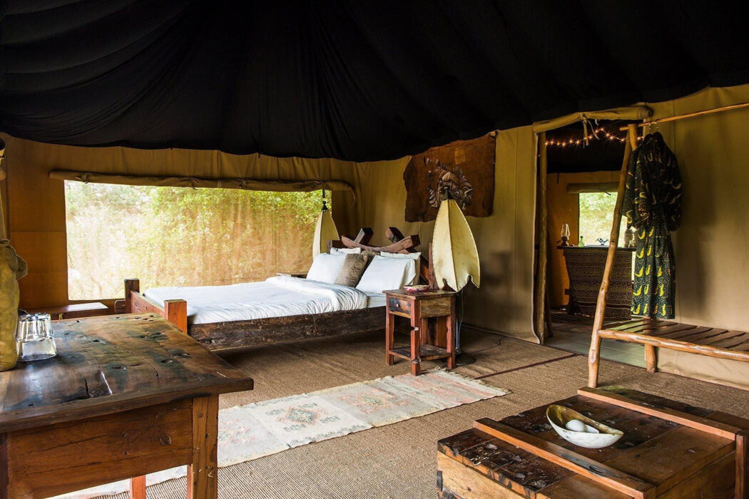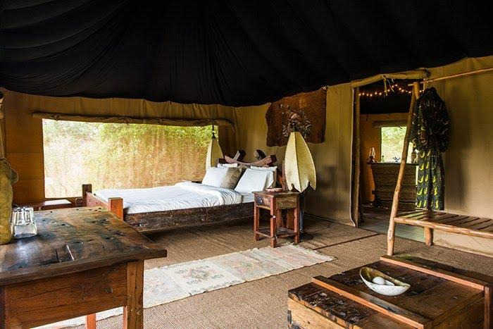 Accommodation: The camp has 12 spacious tents built of materials obtained locally, all with thatched roof and net windows, en suite bathrooms with safari-style showers. Hot showers are provided at any time of day, but keep water impact low through collecting rainwater and using compost toilets. Water is heated with twigs and camp waste in fuel-efficient boilers. Candlelight and kerosene lanterns provide romantic evening light. No electricity is used in the camp except in the reception area to charge camera batteries and power the wireless internet.